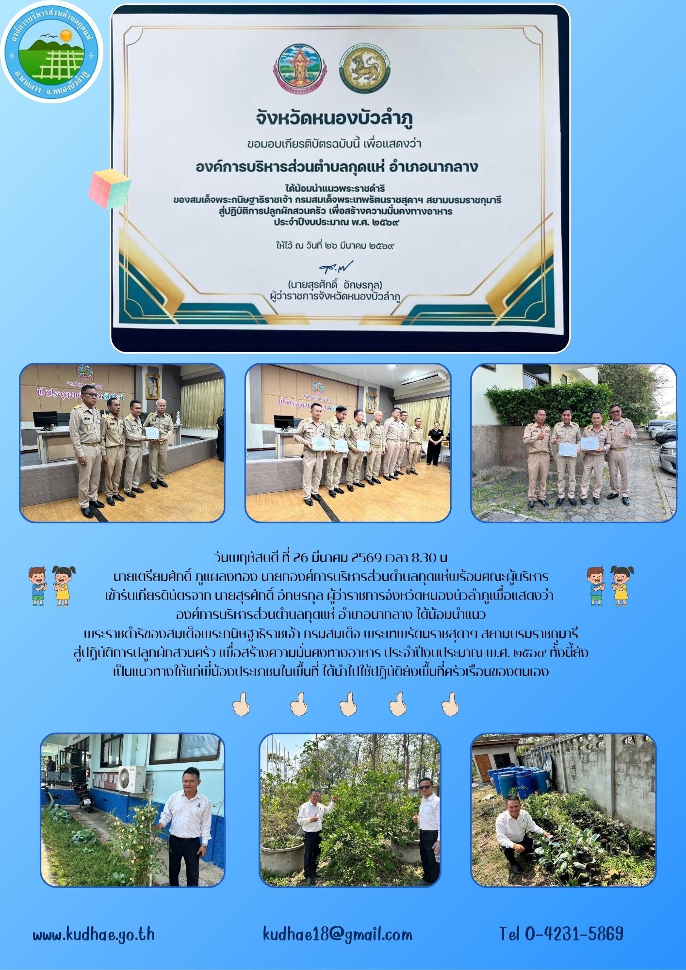 เข้ารับมอบเกียรติบัตรจาก นายสุรศักดิ์ อักษรกุล ผู้ว่าราชการจังหวัดหนองบัวลำภูเพื่อแสดงว่า